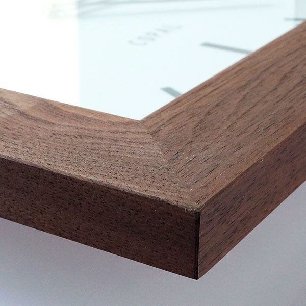フラットな時計枠なので、直線的な木目と黒みがかった茶色のシックな色合いが楽しめる、ウォールナット木枠。こげ茶木枠のように、木材を厚くコーティングするような塗装をしていないので、木本来の艶やかさや風合い、手触りが楽しめます。引き締まった色合いが、インテリアとしても楽しめる、高級感あふれる時計枠です。