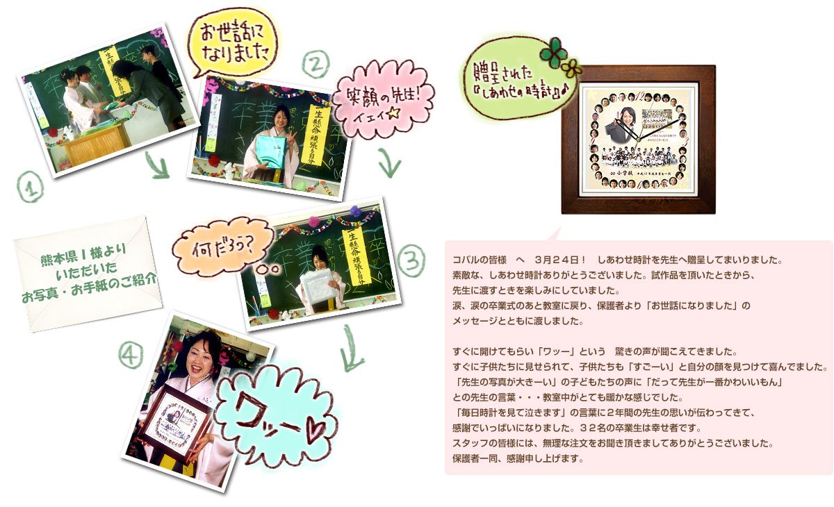 卒業・卒園記念品・先生への贈り物として クラスの皆様から先生へ感謝の気持ちをこめて 【クラスを代表してご依頼下さいましたN様のお言葉です】 無事、卒業式を終わらせる事ができました。 先生にも時計を渡すことができました。 先生はしばらく絶句したあと、 女子はもちろんですが、 先生と僕たちが出会ったのは、2年前。 津波の影響でこちらの学校に異動してきた先生は いろいろあった2年間だけど、 また機会があればお願いしたいと思います。 【N様の お母様にいただいたお言葉です】 中学校卒業に当たって、 高校受験を控え、 ネクタイ、そろいのTシャツ、ジャージ、カバン・・・ 正直子どもたちが扱う金額としては 先生と子どもたちが出会ったのは、震災明けの4月です。 学校も家庭も被災し、 さらに原発事故で、 先生は、福島の沿岸部で、津波の被害に遭われています。 互いを大切に思いながら過ごした時間は、 幸せ時計で先生と子どもたちの思いが |